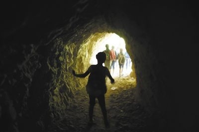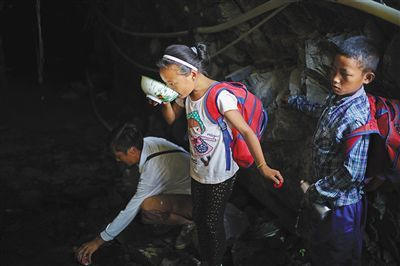 陈古吉在一个水库施工洞穴找到水源,打来水让孩子轮流喝。