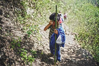 连续山路徒步5小时,8岁的吉觉尔子汗如雨下。