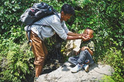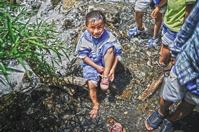 大约行走了4个小时,经过一个小溪时,6岁的吉克成业脱下鞋把脚泡在水里。